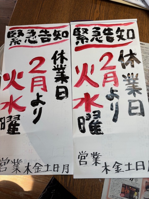 Posted on 2026年1月12日 Posted by 日浦 晃英 雪は溶けています。 昨日は、道路状況が悪く、スタックした車が多数出ていたとのことです。本日は大丈夫、青空が広がっています。 さて、なんども告知しております。2月より休業日が変わります。 よろしくお願いいたします。 それにしても昨日は、風が強かったです。別府へ持って行った風よけが、全く役に立たず、風除けにならなかった。さて、これもひと思案だ。