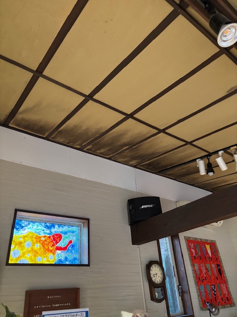 あと天井部分。そして、壁の上部に別府店で使っていた上等の看板(上田社長作)を取り付ける。
