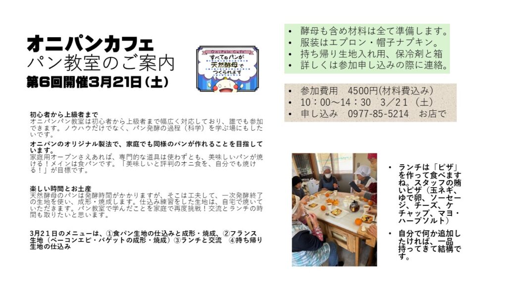 Posted on 2026年3月2日 Posted by 日浦 晃英 早3月。春ですねえ。パン教室・・・ ついに3月。今年の2月は、例年に比べると、お客の減少はそれほどでもなかったかな。特に別府販売は、今までになく好調だった。感謝です。塚原は流石にお客は少なかった・・・。 さて、早めに告知しておかねばならないのがパン教室の件。定着してきた感ありのパン教室。今回も3月の第3土曜日にいたします。 早めに参加の連絡をお願いします。現在4名です。10名くらいまで大丈夫です。