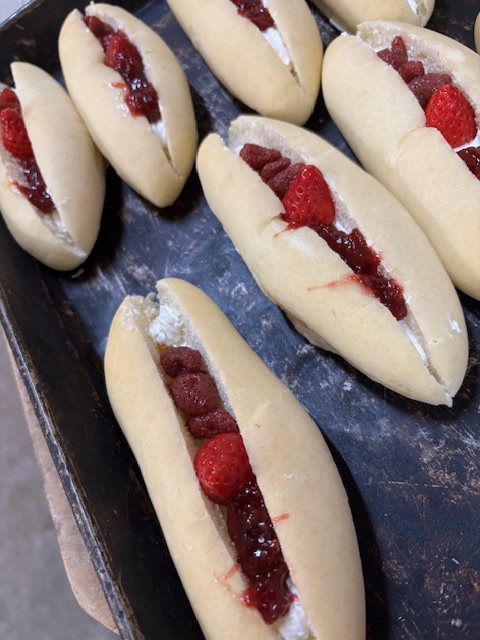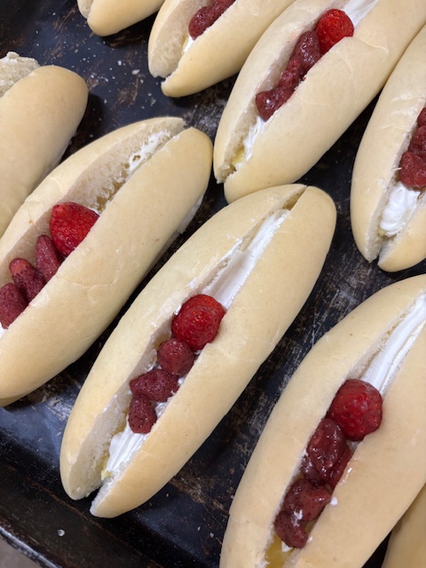 柔らかなコッペに先ずカスタードクリームを敷き、その上にホイップを。そしてイチゴを真ん中に置く。