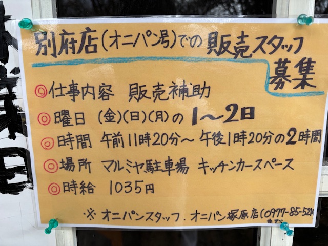 別府販売(マルミヤ駐車場付近)で、パートさんを急募しています。週に1~2回2時間程度。どなたか助けてくれませんか。駅近くの方が便利だとは思いますが。