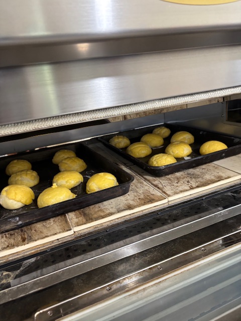 これは、フランス成形で細長いパンを作っているところです。フランス(バゲット)などをつくる技はいろいろと応用が利きます。オニパンで言えばミルククリームやピーナッツクリームなどがつくれます。コッペパンなども。生地が小さいのでむずかしかったでしょうが、生徒さんたちは一生懸命、上手につくることが出来ました。